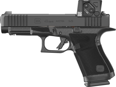 Glock 49 Gen6 A-CUT je pistole velikosti CROSSOVER v ráži 9 mm Luger v konfiguraci s kolimátorem Aimpoint COA, se závěrem s modulárním optickým systémem konstruovaným pro kolimátor Aimpoint COA.