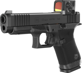 Glock 49 Gen6 A-CUT je pistole velikosti CROSSOVER v ráži 9 mm Luger v konfiguraci s kolimátorem Aimpoint COA, se závěrem s modulárním optickým systémem konstruovaným pro kolimátor Aimpoint COA.